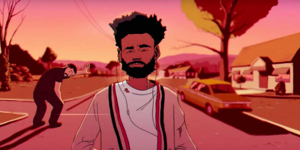 Childish Gambino, has unveiled a new video for “Feels Like Summer”. The incredible animated visual, created by Justin Richburg, depicts Glover walking down a neighborhood street. Along the way, he encounters various musicians and celebrities, including ASAP Rocky and Solange playing a game of tug of war with The Weeknd; Drake chasing after Future on a bike; Janelle Monáe on a skateboard; Oprah braiding Lil Uzi Vert’s hair; and Rae Sremmurd spraying J. Cole with a water gun. However, most striking is a scene in which Kanye, crying and wearing a MAGA hat, is consoled by Michelle Obama. Watch the video below.